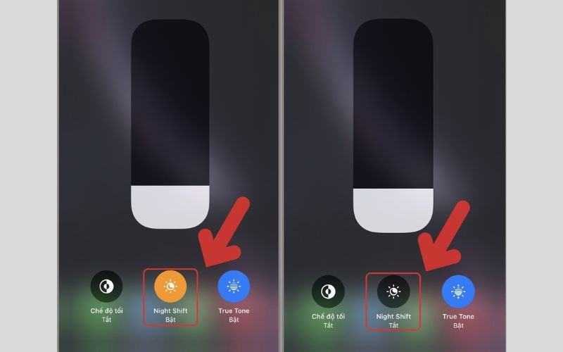 - Trung tâm điều khiển > Ấn giữ biểu tượng điều chỉnh ánh sáng màn hình > tắt chế độ Night Shift