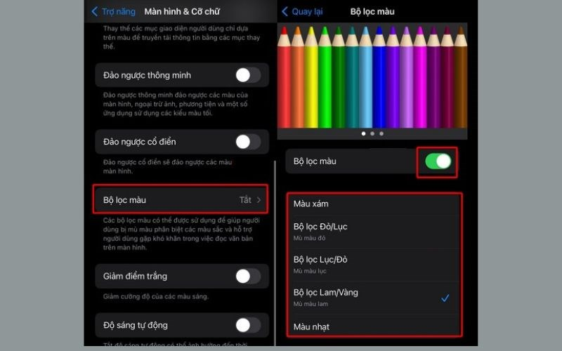 - Vào Cài đặt → Trợ năng → Màn hình & Cỡ chữ → Bộ lọc Màu hoặc Cân bằng trắng: điều chỉnh các thanh trượt để cân bằng màu sắc.