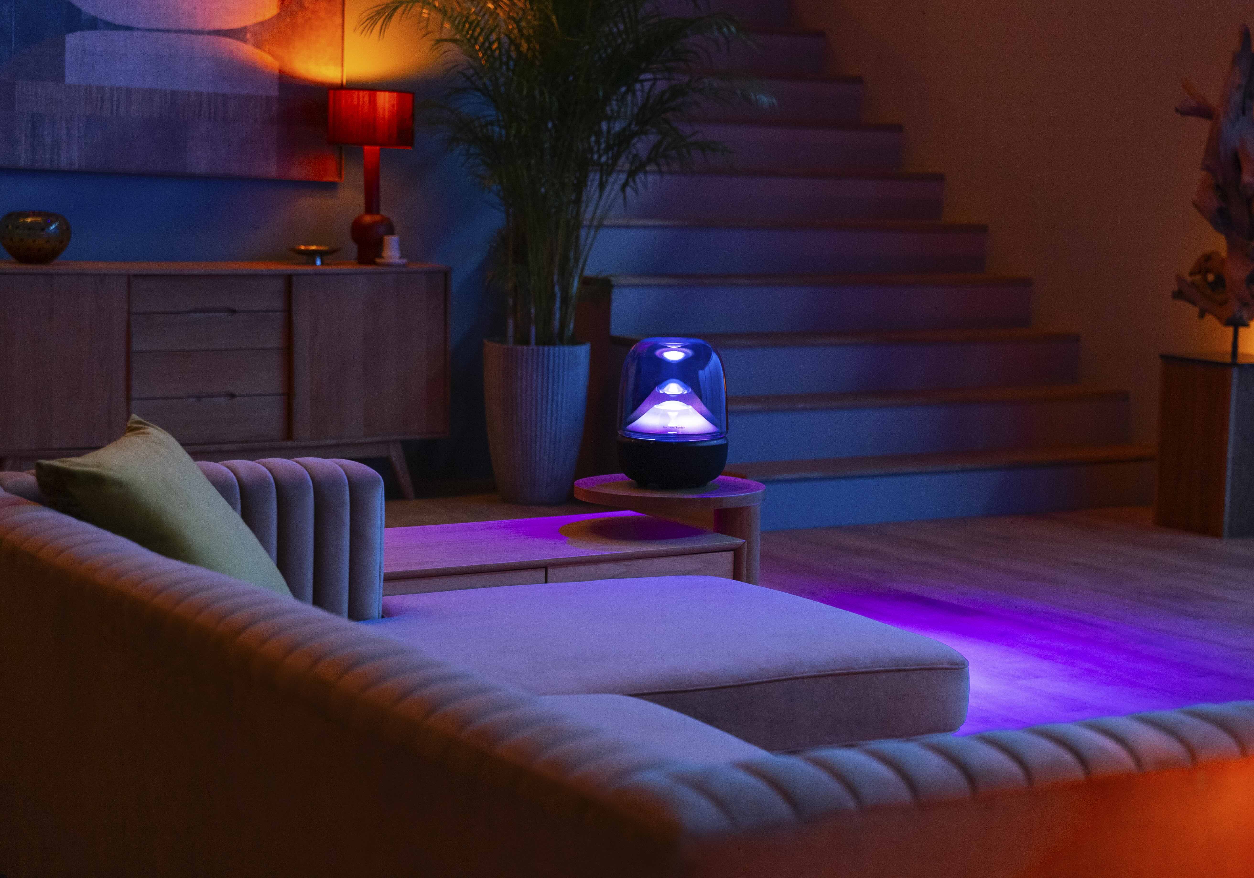 Một trong những điểm nổi bật nhất của Aura Studio 5 là hiệu ứng ánh sáng LED tích hợp bên trong thân loa. Ánh sáng thay đổi linh hoạt theo nhịp nhạc, tạo cảm giác sống động và cuốn hút. Khi đặt trong phòng tối hoặc không gian chill, hiệu ứng này giúp trải nghiệm nghe nhạc trở nên ấn tượng hơn rất nhiều.