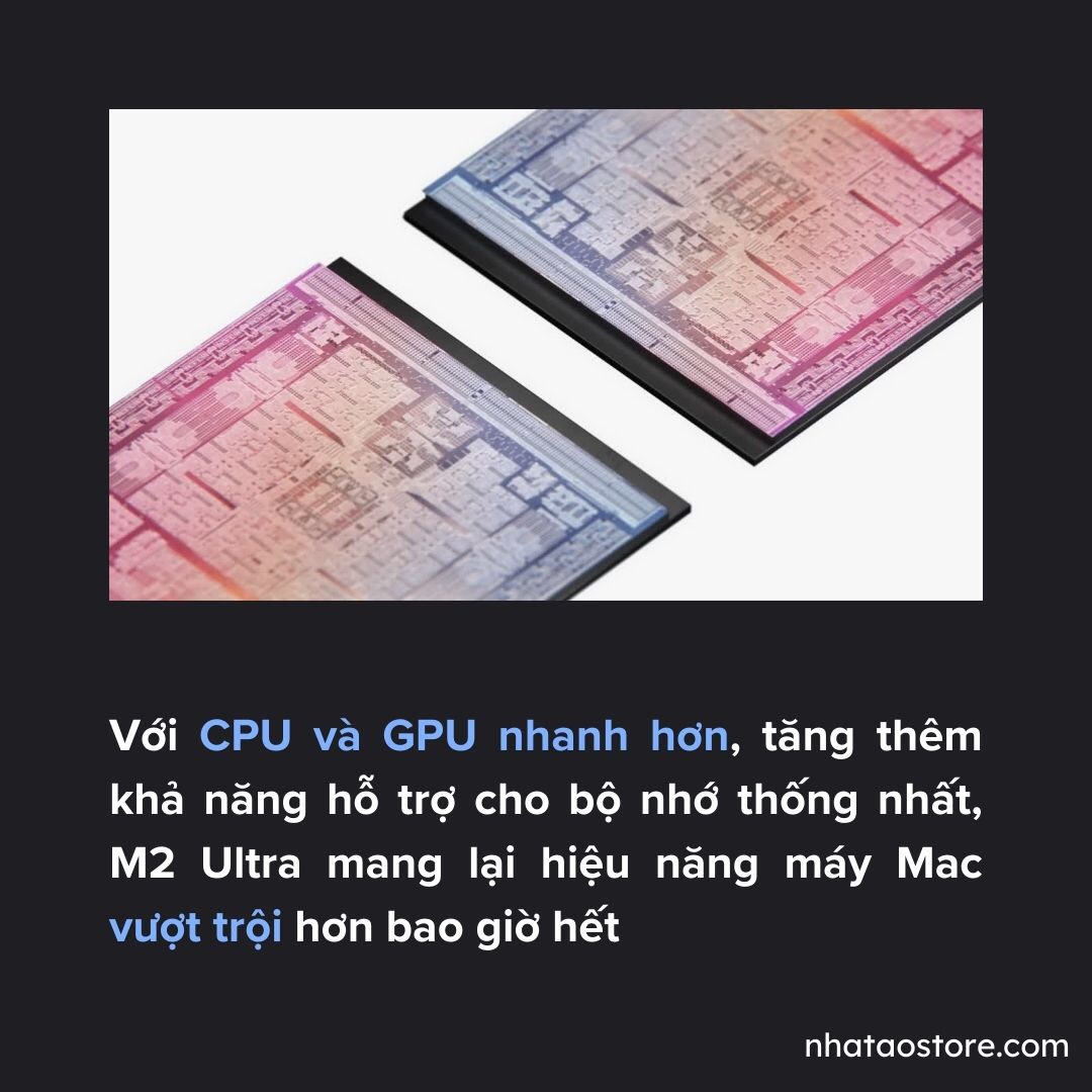 Cấu trúc bộ nhớ thống nhất hỗ trợ dung lượng bộ nhớ kỷ lục lên đến 192 GB, cao hơn 50% so với chip M1 Ultra, cùng băng thông bộ nhớ 800 GB/s — gấp đôi chip M2 Max. M2 Ultra hỗ trợ CPU mạnh mẽ, nhanh hơn 20% so với chip M1 Ultra, GPU lớn hơn và nhanh hơn 30%, cùng Neural Engine nhanh hơn 40%.1